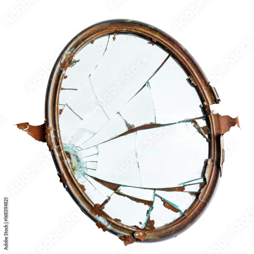 Shattered mirror with rusty frame symbolizes broken dreams and lost reflections of the past