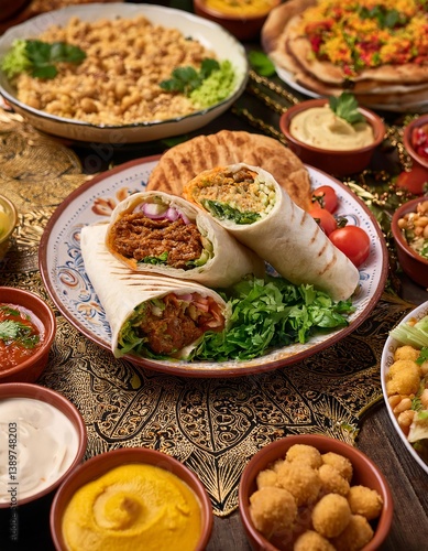 Shawarma wraps served on decorated table with various middle eastern dishes