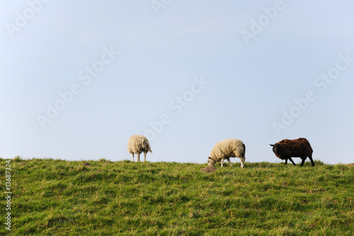 white, black, sheep, animal, farm animal, mammal, wool, grass, landscape, dike, holland, holland, dutch