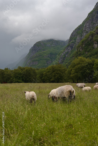 Sheep Grazing in a Meadow with Misty Mountains in Lysebotn, Norway