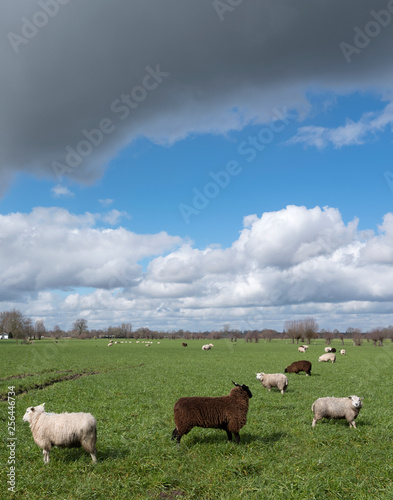 sheep in green meadow near utrecht in the dutch countryside under blue sky and white clouds