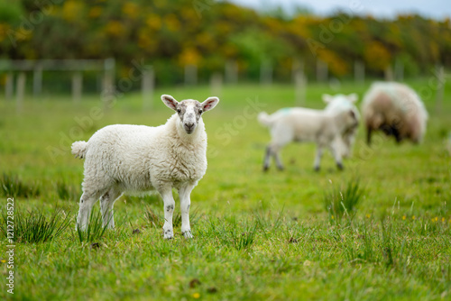 Sheep marked with dye grazing in green pastures. Adult sheep and baby lambs feeding in lush green meadows of Ireland.