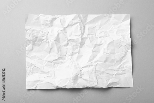 Sheet of white crumpled paper on grey background, top view