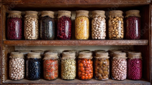 shelf, shelf, food, bean, vegetable, grain, jar, burlap, fabric, wooden, container, storage, preserved, row, organised, collection, variety, pinto beans, corn, pickled, red beans, light, shadow, indoor, kitchen, pantry, bulk, cooking ingredient, dry goods, jute, twine, tied, full, brown, red, white, yellow, orange, maroon, closeup
