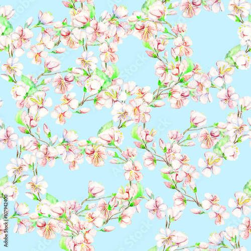 Сherry, apple, flowers. Watercolor seamless pattern.