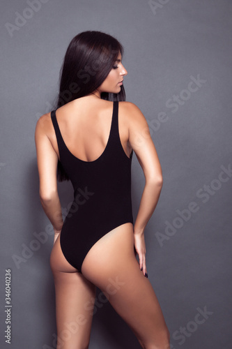leg, brunette, sexy, elegance, form, fitness, bikini, model, thin, woman, beauty, black, pose, girl, ass, studio, young, backside, back, beautiful, swimwear, swimwear, female, pretty, shape, coiffure, lady, butt, fashion, grey