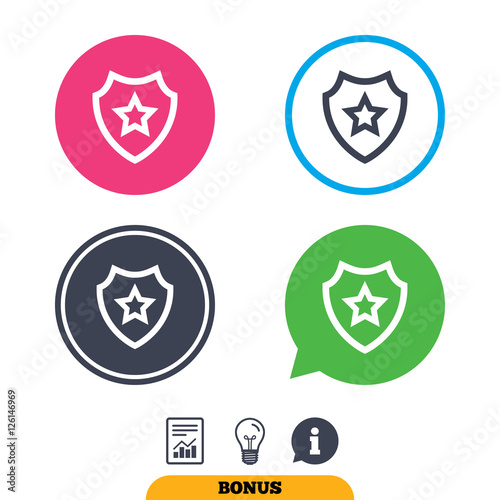 Shield with star icon. Favorite protection symbol. Report document, information sign and light bulb icons. Vector