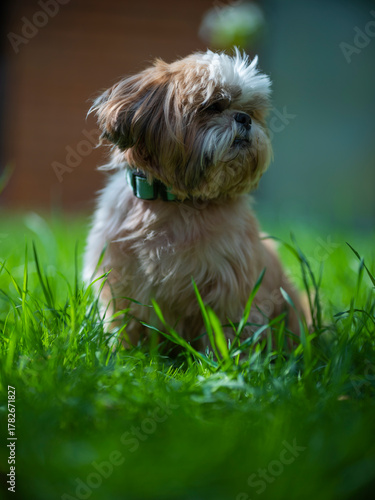 sit, green, grass, garden, shih tzu, pet, nature, cute, puppy, canino, portrait, breed, pet, adorable, fur, hair, domestic, puppy, doggy, dog, animal, summer, forest, greengrass, beautiful, bokeh, camera, small, white, studio, dog, isolated, brown, mammal