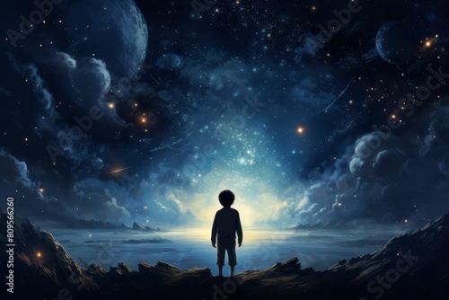 Сhild gazes up at the night sky, dreaming of encounters with beings from other planets.