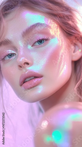 make-up, model, holographic, beauty, portrait, skin, young, highlight, fashion, woman, colours, iridescent, skincare, glossy, lighting, expression, aesthetic, soft, portraiture, style, glowing, creativity, shimmering, eye, reddening, modern, lip, pastel, hair, glamour, femininity, youth, artistry, serene, inspiration, elegant, freshness, effect, natural, shoot, allure, trendy, charme, appearance, detail