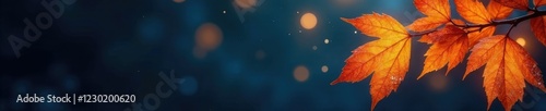 Shimmering golden leaves against a dark blue background, autumn decor, winter wonderland, illuminated leaves