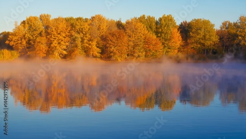 Shimmering reflections of colorful autumn trees mirrored perfectly in still lak