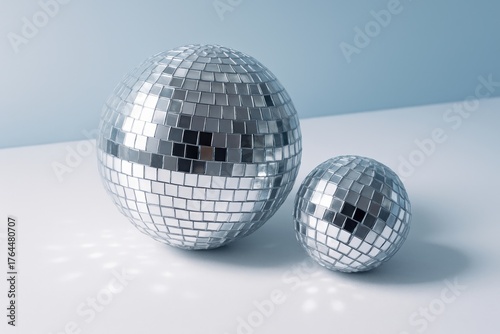 Shimmering silver disco balls elegantly rest on a pristine white surface, casting reflective light patterns against a serene light blue background, perfect for celebrations
