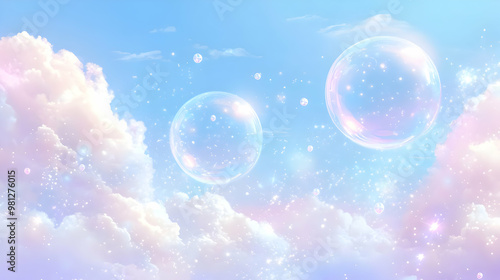 Shiny Bubbles Floating in Pastel Sky with Clouds
