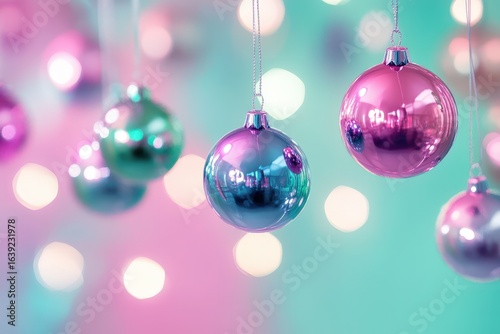 Shiny christmas ornaments in pastel colors against a blurred background.