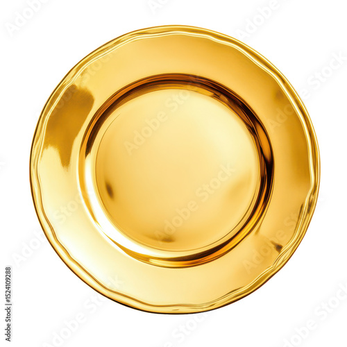 Shiny gold metallic plate with curved edges used for festive table settings or decor, isolated on white