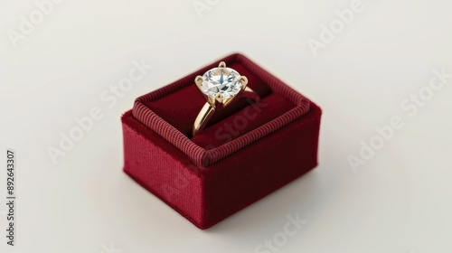 Shiny gold ring with diamond in red velvet box, isolated on white background, ideal for engagement branding