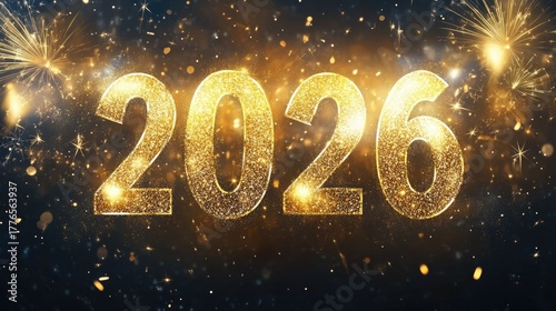 Shiny golden numbers sparkling against a dark night background with glitter particles and fireworks burst, creating a festive New Year celebration scene.