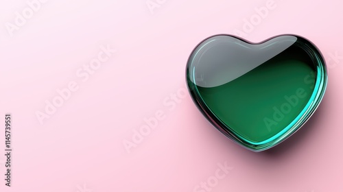 Shiny Heart-Shaped Object with Green Liquid on Soft Pink Background