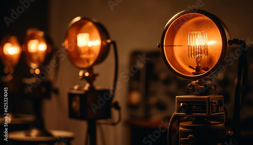 indoor, lens, glasses, spotlight, industry, night, old-fashioned, camera, shiny, old, metal, antique, performance, modern, selective focus, lantern, equipment, lighting equipment, illuminated, technology, tripod, stage, studio, nightlife, heat, temperature, dark, light bulb, electricity, reflector, glowing, science
