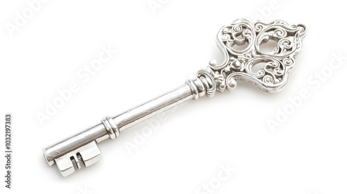 Shiny Ornate Silver Key with Intricate Decorative Details on White Background