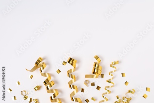 anniversary, background, beautiful, birthday, bright, carnival, celebrate, celebration, christmas, colours, confetti, copy, decor, decoration, decorative, design, event, festival, festive, flat, foil, fun, gold, gold, greeting, group, happy, holiday, joy, lay, many, merry, new, object, party, ribbon, serpentine, shiny, space, spiral, streamer, style, surprise, swirl, text, top, view, white, christmas
