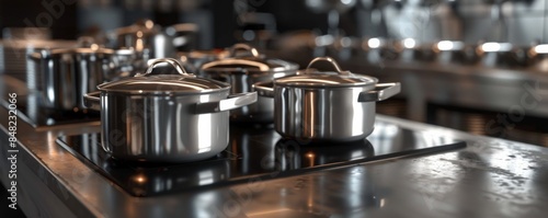Shiny stainless steel pots and pans in luxury restaurant kitchen, banner. Generative AI...