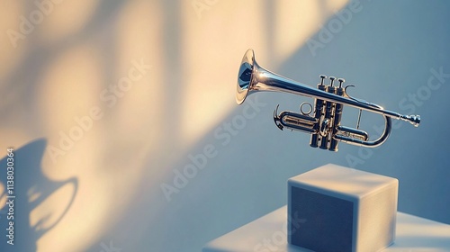 Shiny trumpet on a white cube, soft light.