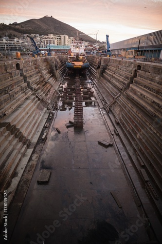 shipping, transportation, departing, harbor, dusk, protection, equipment, transport, staircase, mountain, industry, maritime, absence, railing, safety, parked, vacant, marin, voyage, travel, vessel, cloud, stair, city, tyre, ship, sky, of, at