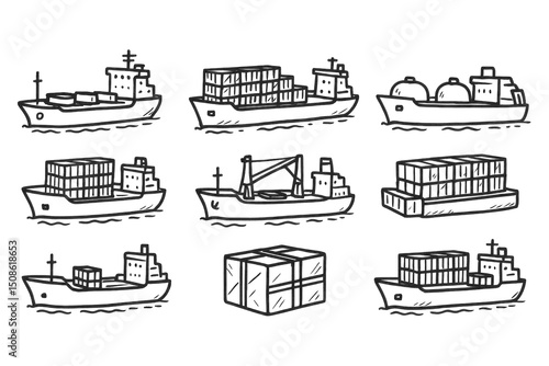 ship, icon, sketch, bulk, carrier, container, tanker, ro, vessel, feeder, general, cargo, black, hand, drawn, line, art, set, isolated, transparent, draw, vignetting, icon, simple
