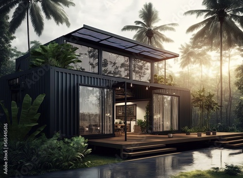 shipping container make as restaurant, office or house, modern and minimalism design, idea for sustainability for environmental preservation, tropical forest Generative Ai