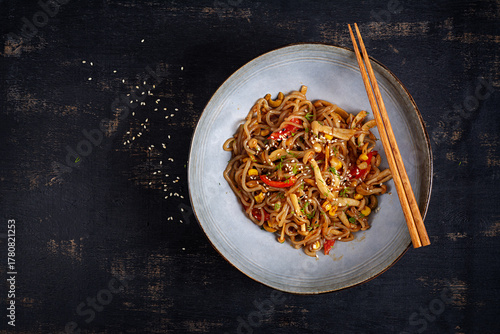 Shirataki noodles stir-fried in spicy soy sauce. Shirataki noodles with shimeji mushrooms. Asian cuisine. Top view.