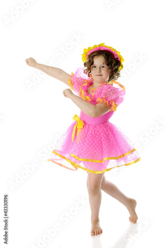 person, children, children, girl, female, young, elementary, dress, frilly, pink, yellow, ribbon, bow, hat, sheer, dot, barefoot beach, dancing, dance, impersonator, pretending, ringlet, happy, smile, white background, playing, acting, act