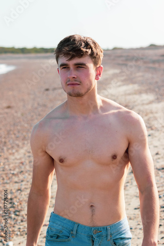 adult, beach, body, caucasian, coast, coastline, fit, fitness, health, healthy, male, man, muscle, muscular, sea, seacoast, shirtless, shore, strong, toned, water, young, young adult, walk, walking, stroll, summer, day, daylight, hot, jean, denim