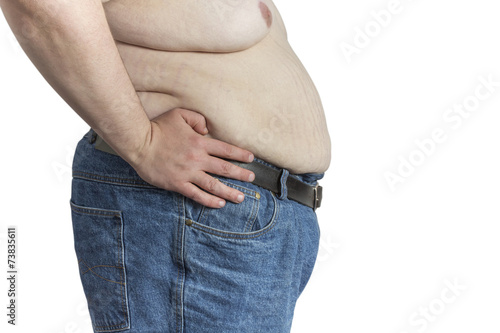 fat, corpulent, corpulent, overweight, fats, thick, adipose, health, diet, nourishment, food, body, shape, self-esteem, self, assurance, esteem, beauty, ugly, belly, stomach, waist, tummy, pouched, bellied, man, male, caucasian, isolated, white, topless, jean, blue