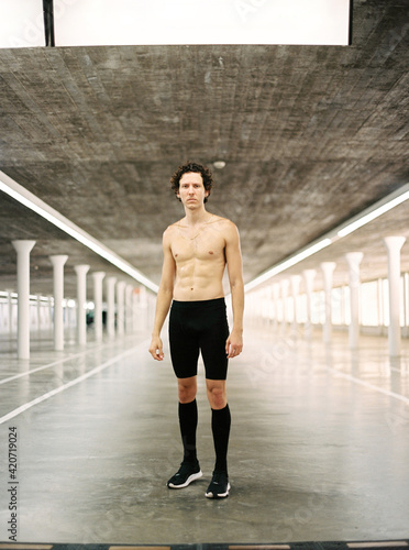 Shirtless sportsman standing in passage