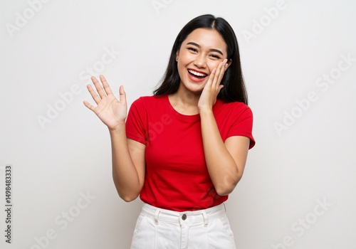 Shocked young woman in a red shirt and white pants. Indonesian Independence day concept. Isolated