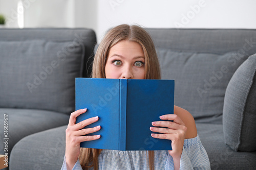 Shocked young woman reading book at home