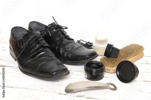 shoe care equipment and formal black shoe on white background