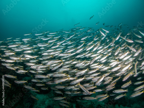 Shool of Yellowtail snapper fish. Andaman sea, Thailand