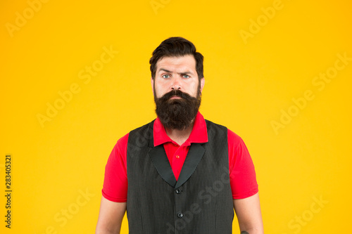 Shop staff concept. Salesman cashier career. Hiring shop store worker. Hospitality staff. Restaurant cafe staff wanted. Man bearded hipster with mustache wear vest and shirt uniform yellow background