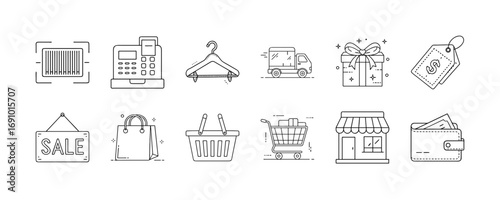shopping, retail, commerce, store, shop, cart, basket, bag, billfold, gift, sale, discount, price, tags, cash, filed, delivery, hanger, market, mall, buy, purchase, consumer, checkout, payment, icon, set, line, outline, collection, illustration, symbol, minimal, design, e-business, online, retailer, good, fashion