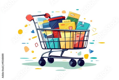 Shopping cart with products, minimalist design, flat illustration on white background, copy space for stock photo with minimal concept, No logo, No Trademark, No text