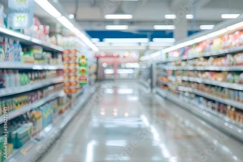 Shopping center, retail shop interior featuring grocery store background for banner with empty area, conceptual defocused picture
