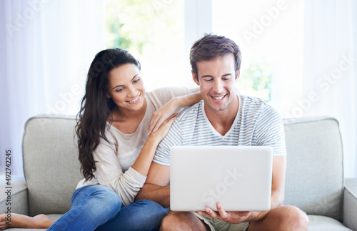 Shopping for their new home. A young couple relaxing on the couch using a laptop.