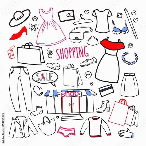 Shopping Hand Drawn Set. Seasonal Sale Woman Fashion Elements Clothing and Accessories. Vector illustration