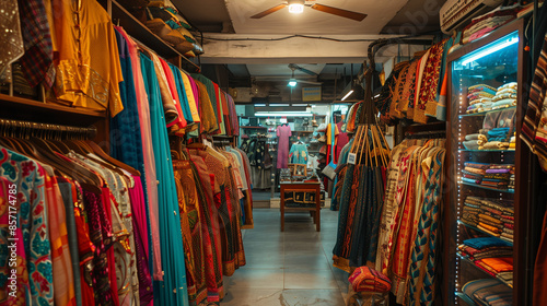 Shopping in a traditional clothes shop in India. Gorgeous saris, kurtas and other beautiful attires that reflect the richness of culture and local crafts.