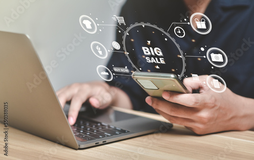 Shopping online concept.consumer holding smartphone,doing online banking transaction. E commerce virtual shopping, secure mobile banking concept,Shopping Online Using Mobile Phone App