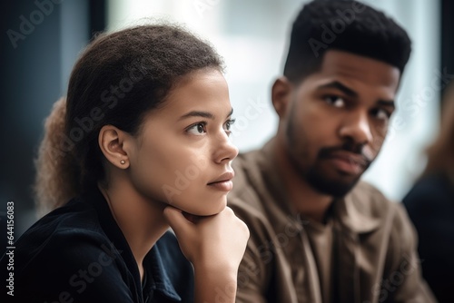 shot of a young woman and man in thoughtful discussion at a seminar