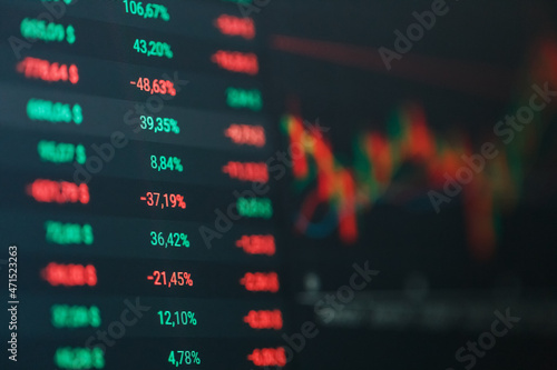 Shot of candles and forex tickers Close-up on a digital screen of stock market changes and volatility price gains or losses.